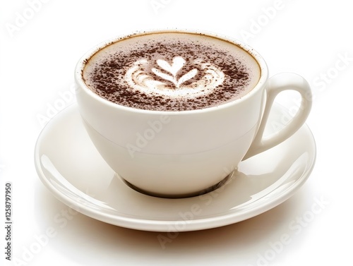 cappuccino, hot drink, latte art, cup, coffee cup, hot drink, beverage, cafes, espresso, milk, foam, cocoa, drink, morning, breakfast, energy, caffeine, relax, comfort, white cup, saucer, isolated, white background, studio shot, food photography, delicious, hot, steam, aroma, cosy, chocolate, dessert, sweet, brown, cream, epicure, artistic, design, image, photo, hi-res