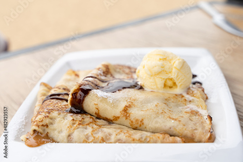 Delicious caramelized condensed milk crepes plate with vanilla ice cream, chocolate and icing sugar. Sweet dessert concept
