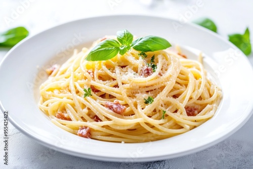 pasta, carbonara, spaghetti, noodle, italian, food, culinary, cookery, dinner, lunch, plate, white, parmesan, cheese, basil, herb, garlic, egg, yolk, bacon, pepper, black, salt, tasty, appetising, epicure, delicious, home, cook, receipe, meal, dish, fresh, simple, traditional, comfort, photo, still, life, close, up, top, view