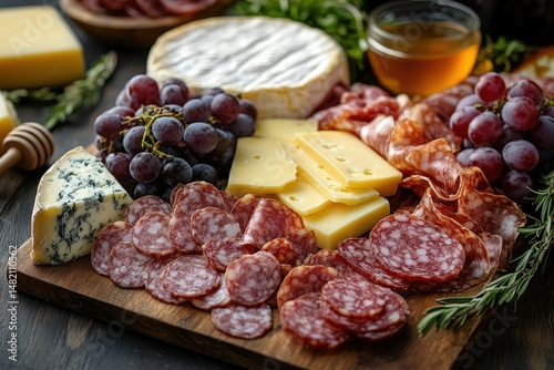 grape, honey, gathering, celebration, blue cheese, pepperoni, entertaining, gourmet food, friends, family, wooden table, charcuterie, culinary arts, party food, fruit, meat, cooking, deli, gathering, picnic, dining table