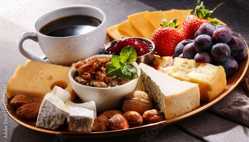 delicious cheese and fruit enjoying a luxurious breakfast with coffee