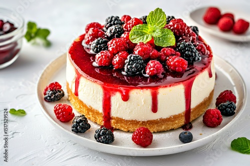 Delicious cheesecake topped with fresh berries and berry sauce.