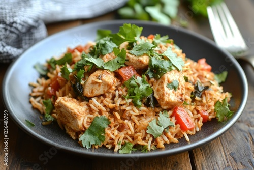 chicken, rice, herb, cilantro, tomatoes, meal, food, plate, cooking, cookery, epicure, dining, receipe, fresh, culinary, tasty, wholesome, nourishment, homemade, spice, comfort, garnish, vibrant, ingredient, colourful, serving, delicious, dinner, lunch, traditional, kitchen, preparation, table setting, healthy, savoury, plated, rustic, wooden, bowl, favor, aromatic, appetence, eat, culinary arts, presentation