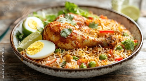 Delicious Chicken Biryani with Boiled Egg and Fresh Herbs