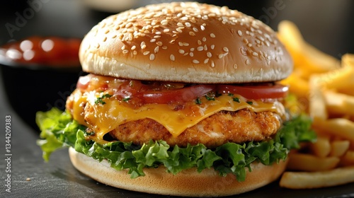 Delicious chicken burger with cheese, lettuce, tomato, and fries on a dark background.