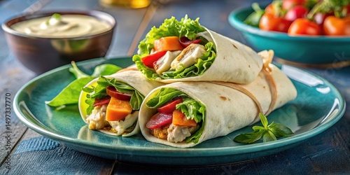 Delicious chicken caesar wraps sitting on a blue plate with a side of fresh veggies and tangy sauce, restaurant, savory