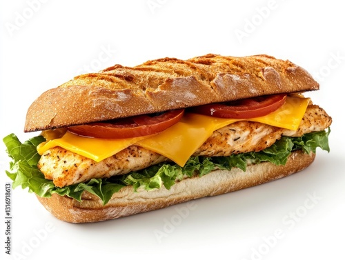 Delicious Chicken Sub Sandwich with Cheese Tomato and Lettuce on White