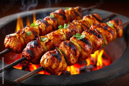 Delicious chicken tikka kebabs grilling on barbecue with flames