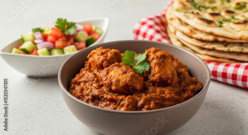 Delicious chicken tikka masala with naan bread and fresh salad indian cuisine food