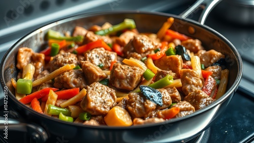 Delicious Chinese Stir-Fry Pork with Vegetables - Close-Up Pan View
