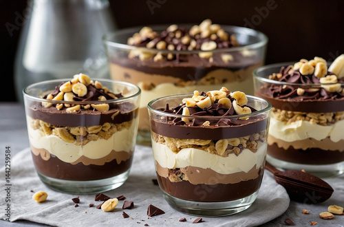 trifle, banana, sweet, layered, glasses, treat, indulgence, creamy, rich, comfort food, closeup, still life, studio shot, brown, yellow, nut, shaving, topping, presentation, elegant, tasty, deliciously, fresh, homemade, baking, pastry, cookery, ingredient, portion, table, plate, spoon, vertical, nobody, photo, image, fruit, yogurt, tiramisu, ice, cereal, dessert