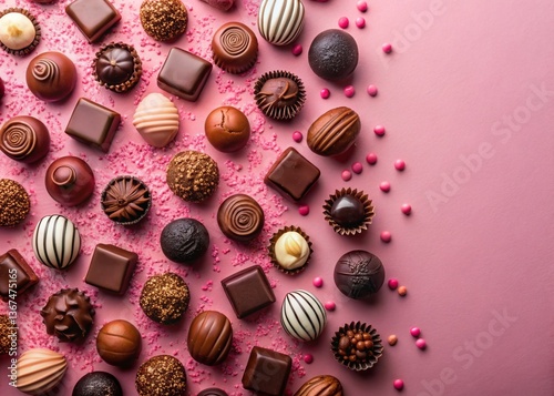 Delicious Chocolate Candies Scattered on a Pink Background - Stock Photo
