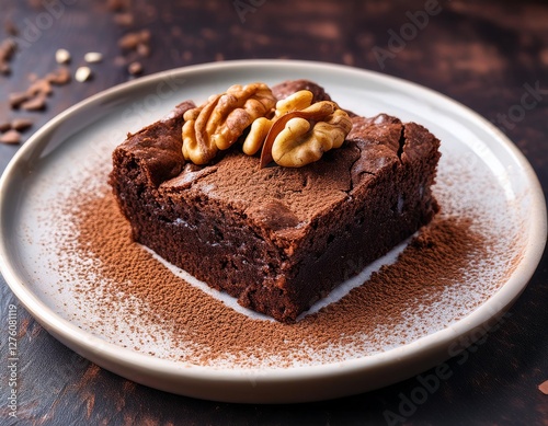 Delicious chocolate walnut brownie served on a plate with cocoa powder on a wooden table