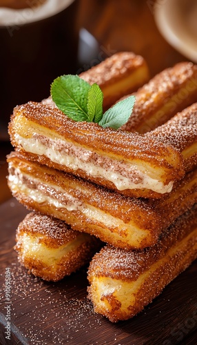 Delicious churros stacked on a wooden surface, sprinkled with sugar and garnished with mint, perfect for dessert lovers.