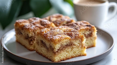 Delicious cinnamon coffee cake served on a plate beside a steaming cup of coffee