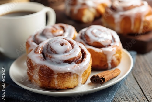 cinnamon, cinnamon roll, pastry, sweet, dessert, breakfast, glaze, icing, sugar, baked, bakery, fresh, homemade, delicious, tasty, food, hot drink, cup, drink, beverage, plate, wooden, table, napkin, still life, closeup, warm, treat, snack, morning, brunch, indulgence, comfort food, rustic, epicure, brown, white, dough, swirl, spiral, cinnamon stick, spice, aromatic, favor, deliciously, danish