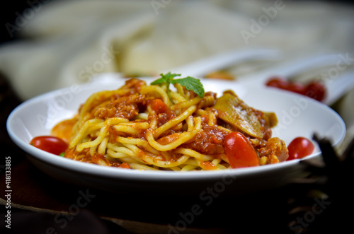 Delicious classic Italian spaghetti with tomato sauce, Parmesan cheese and mint leaves on a plate. There is a writing area.