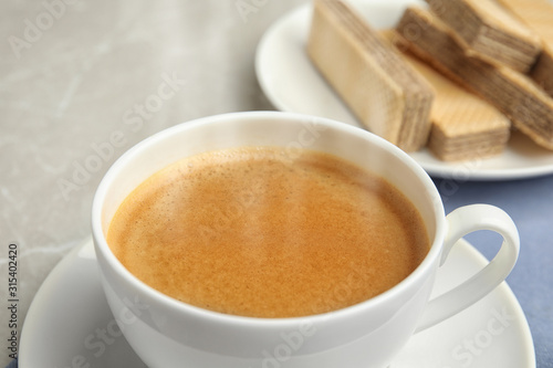 Delicious coffee and wafers for breakfast on grey table, closeup