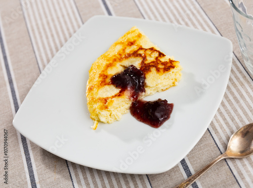 Delicious cottage cheese casserole with cherry or raspberry jam