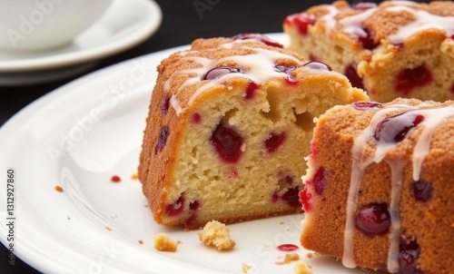 cake, cranberry, dessert, baking, sweet, moist, slice, glaze, food, treat, sweet, favor, homemade, plated, delicious, presentation, snack, oven, pastry, sugar, cooking, epicure, indulgent, fruit cake, cosy, inviting, enticing, colourful, festive, culinary, nourishing, hearty, cheerful, wholesome, appetising, comfort food, occasion