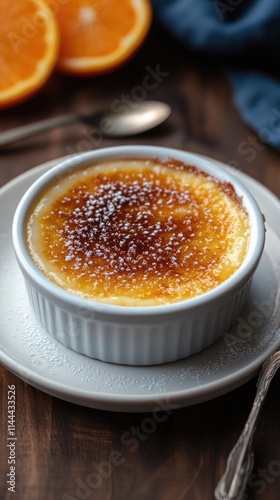 dessert, food, sweet, custard, creamy, delicious, epicure, orange, citrous, fruit, spoon, plate, serving, dish, baked, sugar, powdered sugar, culinary, cookery, eatery, cafes, homemade, receipe, cooking, background, closeup, tasty, freshness