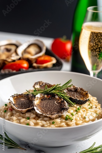 Delicious creamy risotto delicately garnished with black truffle and rosemary sits elegantly beside a glass of sparkling wine. AI Generated