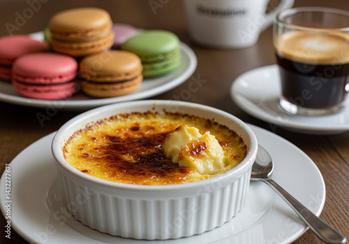 Delicious Creme Brulee with Macarons Coffee Dessert Indulgence