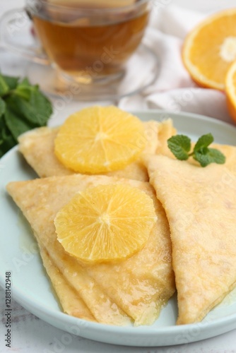 Delicious Crepes Suzette on white wooden table, closeup