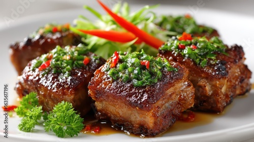 Delicious Crispy Pork Belly Bites with Fresh Herbs and Chili Peppers