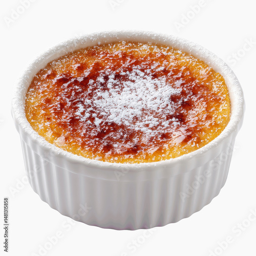 Delicious Cr�me br�l�e in a white ramekin, topped with powdered sugar