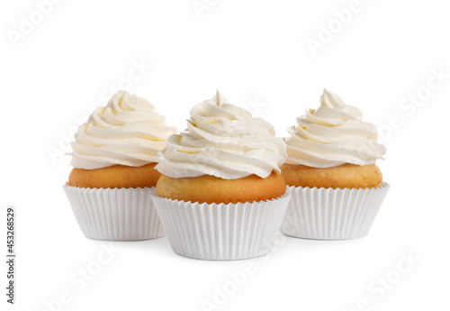 Delicious cupcakes decorated with cream on white background