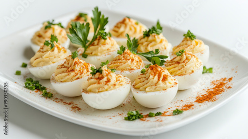 Delicious deviled eggs garnished with crispy bacon bits and chopped green onions, offering a savory twist to the classic appetizer.