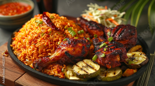 Delicious dish of spicy grilled chicken legs, jollof rice, and roasted plantains, served on a rustic plate with garnish