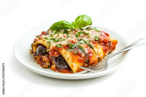 Delicious eggplant rollatini dish plated elegantly with tomato sauce and fresh basil on a white background