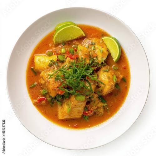 fish, curry, seafood, dish, food, cookery, meal, lunch, dinner, receipe, spicey, flavorful, tasty, delicious, aromatic, herb, lime, wedge, fresh, ingredient, cooking, culinary, style, presentation, plating, white, bowl, epicure, eatery, photo, studio, shot, overhead, view, ethnic, international, asian, indian, thai