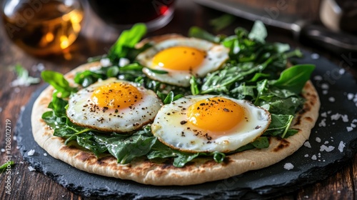 Delicious flatbread topped with fresh spinach and perfectly cooked sunny side up eggs for a wholesome meal