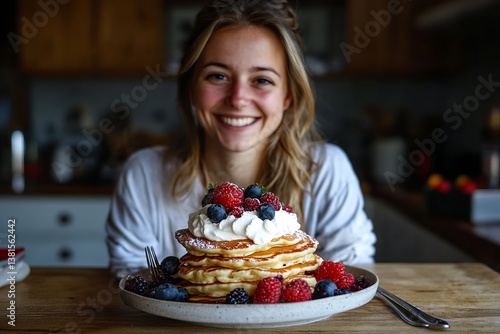 Delicious Fluffy Pancakes Stack with Fresh Berries Whipped Cream Sweet Breakfast Food Photography Woman Happy Smiling Kitchen Background eat meal cute