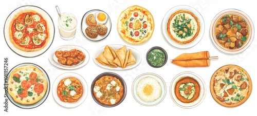 food, illustration, dish, cookery, pizza, dinner, meal, breakfast, lunch, eatery, delicious, tasty, savoury, sweet, drink, beverage, sauce, vegetable, cheese, meat, chicken, fish, rice, bread, spice, herb, favor, culinary, gastronomy, epicure, plate, bowl, table, dining, eat, gourmand, appetence, favor, fresh, colourful, ingredient, watercolor