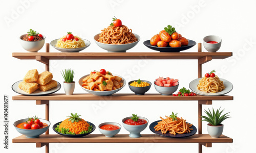 Delicious Food Variety on Wooden Shelves - Vibrant Food Photography.