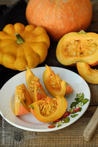 delicious, fresh, pumpkin, wood, table, food, yellow, autumn, sweet, vegetable, knife, ripe, diet, gold, seed, halloween, market, garden, tasty