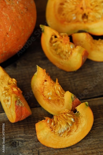 Delicious fresh orange pumpkin on wooden table
