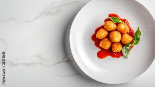 fried, cheese, ball, tomatoes, sauce, basil, garnish, snack, delicious, food, tasty, dish, savoury, bite, italian, cookery, epicure, meal, plate, white, background, herb, photo, culinary, lover, party, top, view, garnishing, fresh, ingredient, presentation, styling, eatery, quality, homemade, comfort, art, cooking, mediterranean, marble, crispy, red, artisan, decoration, down, copy space
