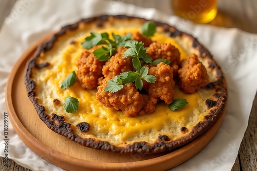 Delicious fried chicken topped flatbread cozy restaurant food photography warm atmosphere close-up shot culinary delight