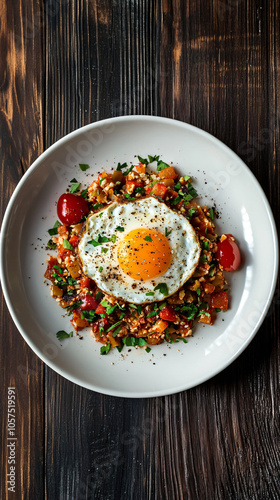 Delicious fried egg is served on a bed of seasoned vegetables and herbs on a white plate, set on a dark wooden table
