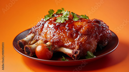 Delicious German Honey Roasted Pork Knuckle yummy grilled meat sweet and sour sauce vegetables fresh orange background. food photography advertising fashion restaurant cuisine gourmet wallpaper