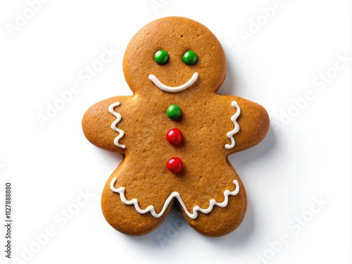Delicious gingerbread man, top view, white background, ideal for Christmas baking.