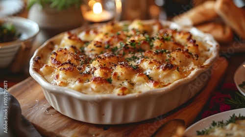 Delicious Gourmet Macaroni and Cheese in a White Ceramic Dish with a Crispy Golden Topping Perfect for Food Blogs and Recipe Websites Showcasing Comfort Food at Its Finest