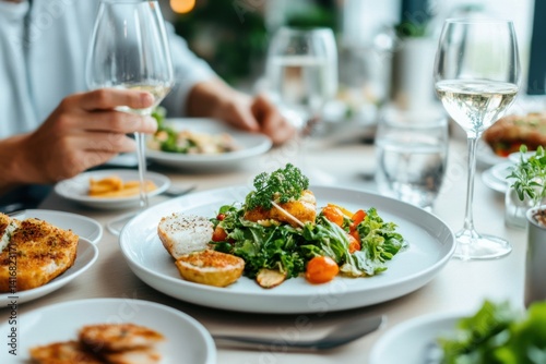 Delicious gourmet meal served at a modern restaurant during a leisurely lunchtime gathering with friends