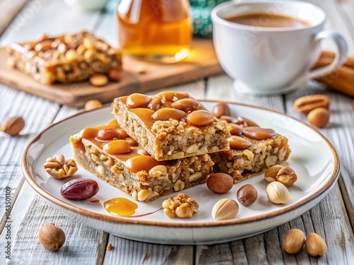 Delicious Granola Bars with Caramel, Nuts & Flakes - Ceramic Plate