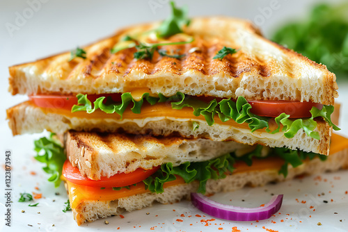 Delicious grilled cheese sandwich with fresh lettuce, tomato, and crispy golden bread, tasty homemade snack, healthy vegetarian meal, perfect for breakfast, brunch, or quick lunch.